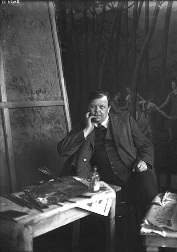 Juho Rissanen ateljeessaan Saint-Germaine-en-Layessa, Ranskassa 1923 taustalla teoksen Piirileikki metsässä keskimmäinen osa